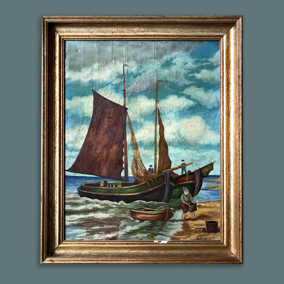 Ölgemälde: G. Buchrowitz – Fischer beim Zeesenboot am Strand