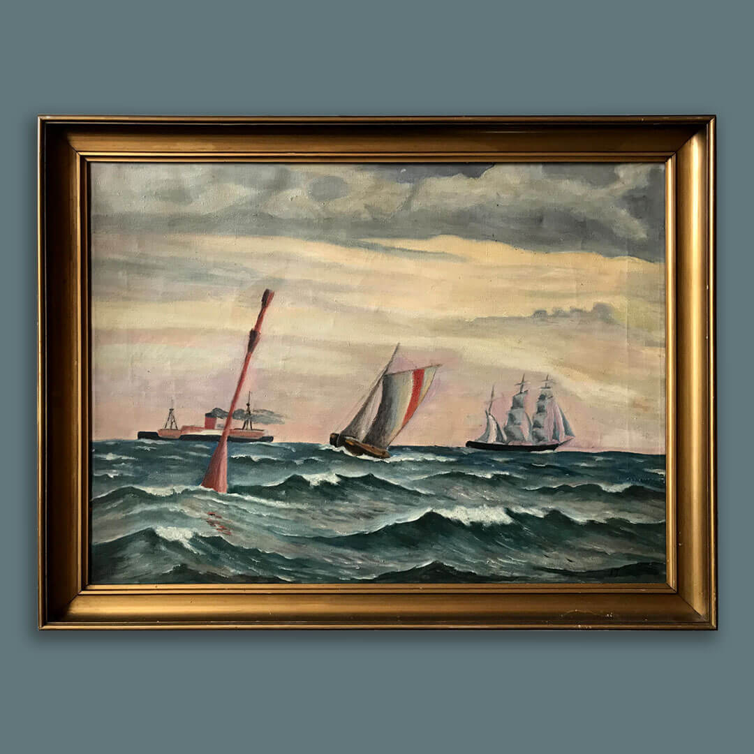 Schiffe ahoi! Auf diesem alten Ölgemälde begegnet uns eine stürmische See mit Wellen und Wind. Nicht nur die Segelschiffe haben mit dem Wind zu kämpfen, sondern auch die Boje und der Frachter. Gleichzeitig wirkt der ganze Anblick durch den rötlichen Himmel friedlich und kraftvoll.